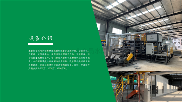 整套設備采用水稻育秧盤成型機配套多層烘干線,全自動化、產(chǎn)量高、成型效率快、使用清潔能源烘干產(chǎn)品、節(jié)能環(huán)保。適合大批量規(guī)?;a(chǎn),專門針對大面積平原耕地供應水稻育秧盤。本公司積累數(shù)十年械制造應用經(jīng)驗,吸收國外先進技術并不斷改進,目前,單臺按年產(chǎn)量分別為500萬及1000萬片。