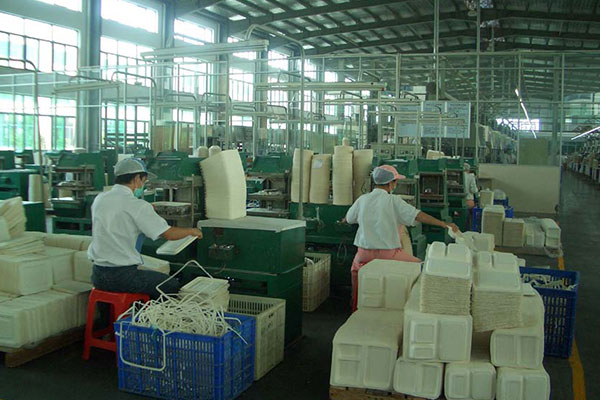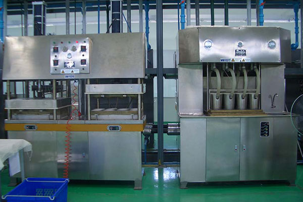 紙漿模塑一次性餐飲具生產線以木漿及各類草漿的漿板為原料,經碎解、篩選、磨漿、添加化學劑等工藝調配成一定濃度的漿料,然后通過真空作用使紙漿均勻地附著在特制的金屬模具上形成濕坯制品,再經干燥、熱壓、消毒工序生產出一次性紙漿模塑餐飲具制品。