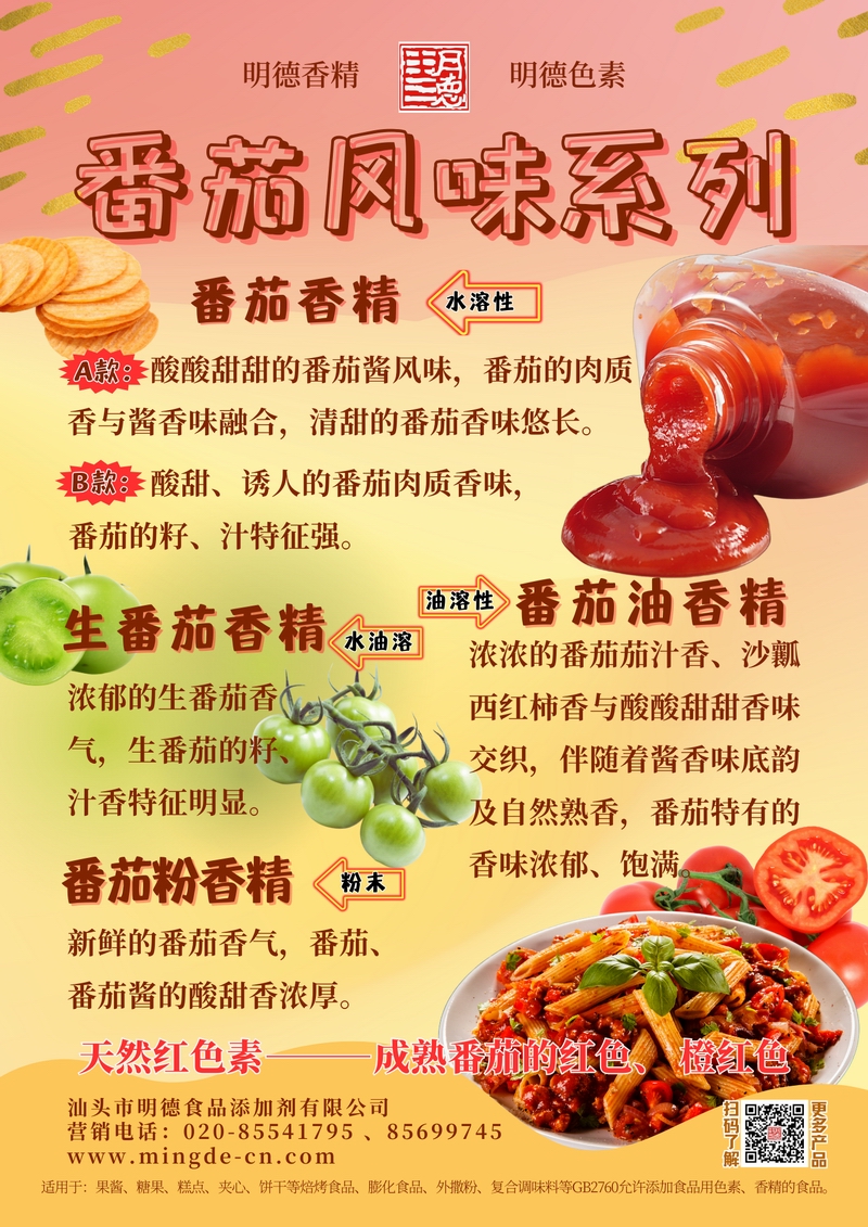 明德番茄風(fēng)味系列香精 酸甜鮮爽 覆蓋多樣應(yīng)用場景汕頭市明德食品添加劑有限公司推出的番茄風(fēng)味系列香精,覆蓋水溶性、油溶性與粉末香精,兼顧番茄醬、鮮番茄與成熟番茄等多種風(fēng)味調(diào)性。產(chǎn)品真實穩(wěn)定,適用于飲料、醬料、烘焙、休閑等多種B端場景。