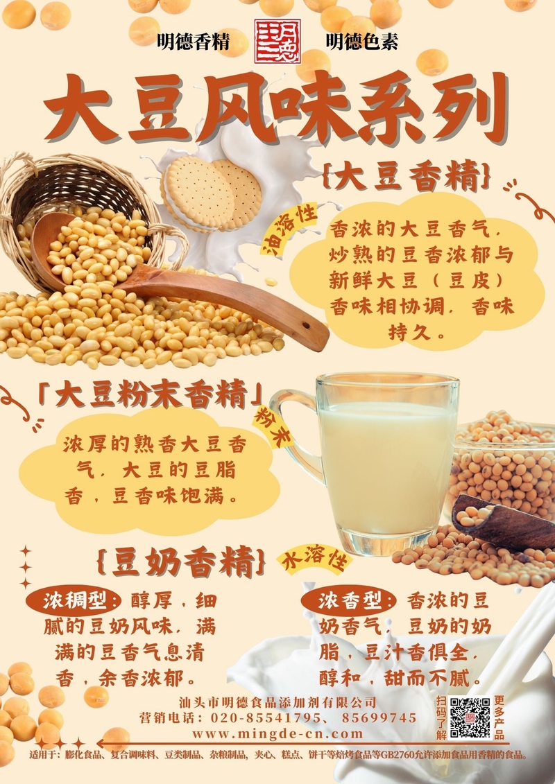 如需獲取不同版本風(fēng)味樣品或配方方案,歡迎聯(lián)系明德團(tuán)隊(duì)。我們致力于為食品工廠提供真實(shí)、安全、高性價(jià)比的香精解決方案。汕頭市明德食品添加劑有限公司推出的大豆風(fēng)味系列香精,覆蓋大豆香精、大豆粉末香精、豆奶香精等多種調(diào)性,風(fēng)味真實(shí),留香穩(wěn)定,適用于膨化休閑、復(fù)合調(diào)味、豆制品及飲料等B端工廠,幫助快速打造具有記憶點(diǎn)的大豆類風(fēng)味。